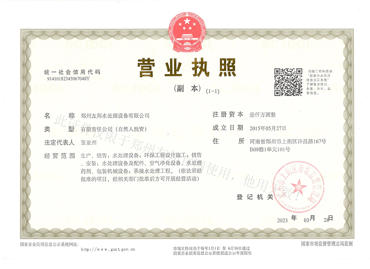 • 2020.07.03 鄭州友邦水處理設備有限公司——營業執照